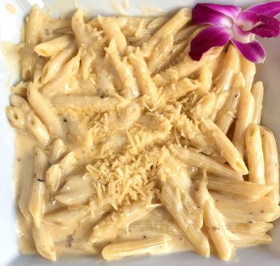 Hey there pretty lady, come here often? Talk about a first impression. Although I cropped this a bit and you can’t quite see the plate, it was a very cool, asymmetrical number. Top that off with the flower garnish, and this is one lovely mac and cheese-wouldn’t you agree?