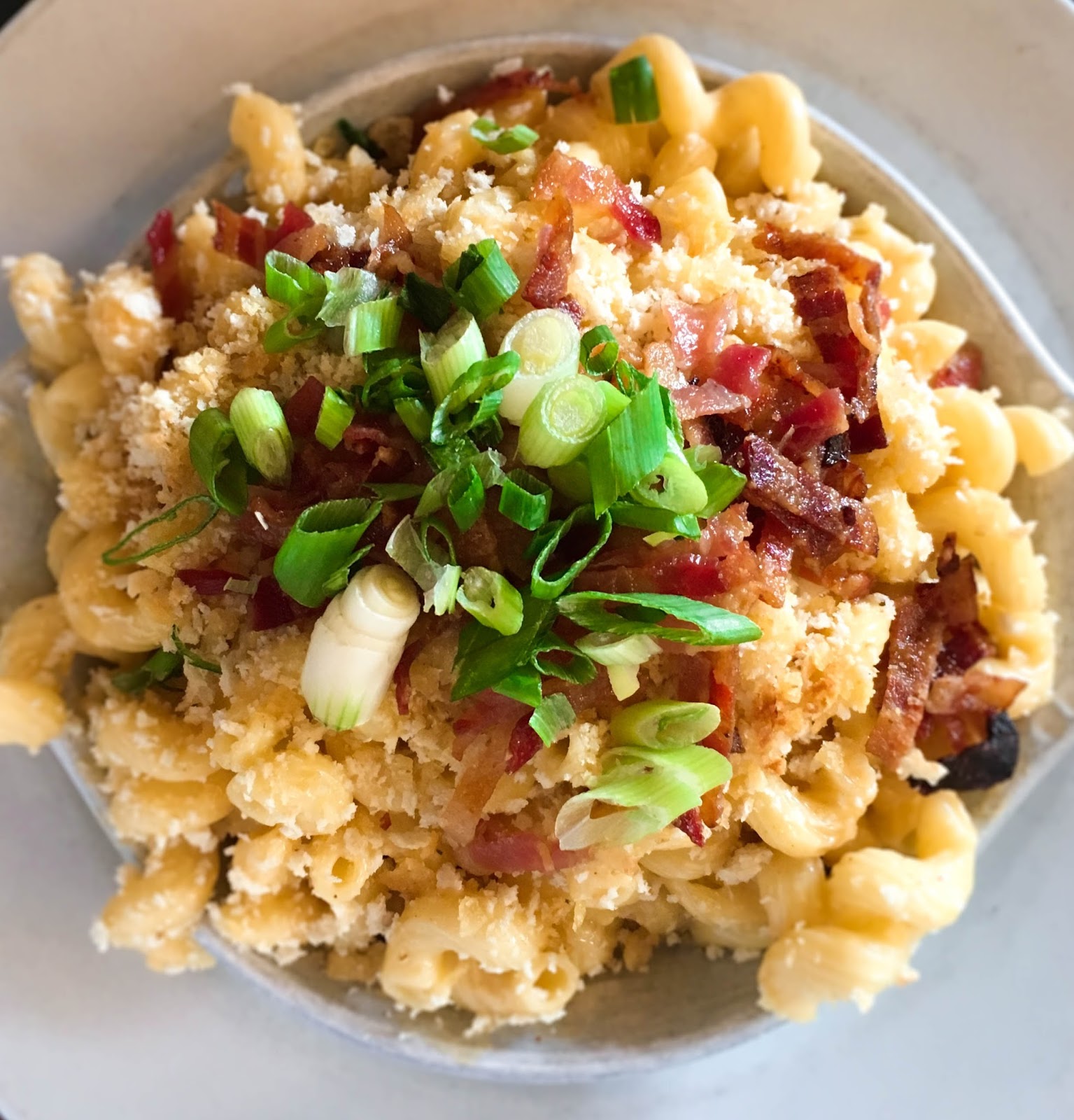 Beautifully al dente cavatappi pasta with a dusting of crispy Panko, juicy bacon and fresh green onion, rounded out by the smooth cream sauce. Superb!