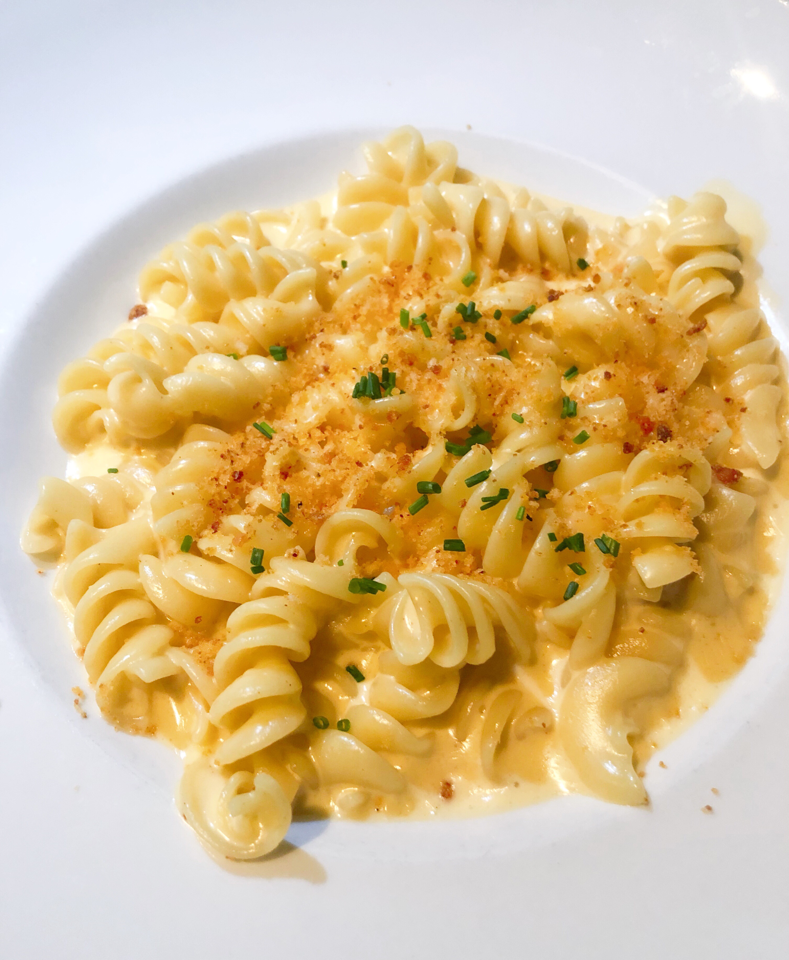 A dazzling aesthetic. I haven’t seen a mac plated in a flat bowl in quite some time, which is a crying shame. Serving it as such really gives it the legitimacy of a full-blown entree, and makes for a classy look.